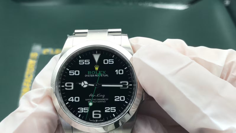 Ανακαλύψτε το Air-King 126900 40mm από την Clean Factory, ένα από τα πιο ρεαλιστικά και υψηλής ποιότητας αντίγραφα της σειράς Professional. Διαθέτει κάσα από ανοξείδωτο ατσάλι 904L, μαύρο καντράν με πράσινες και κίτρινες λεπτομέρειες, καθώς και το εμβληματικό πράσινο logo Rolex. Ο μηχανισμός Cal.3230 Clone εξασφαλίζει ομαλή λειτουργία, σταθερή ακρίβεια και power reserve έως 70 ώρες.