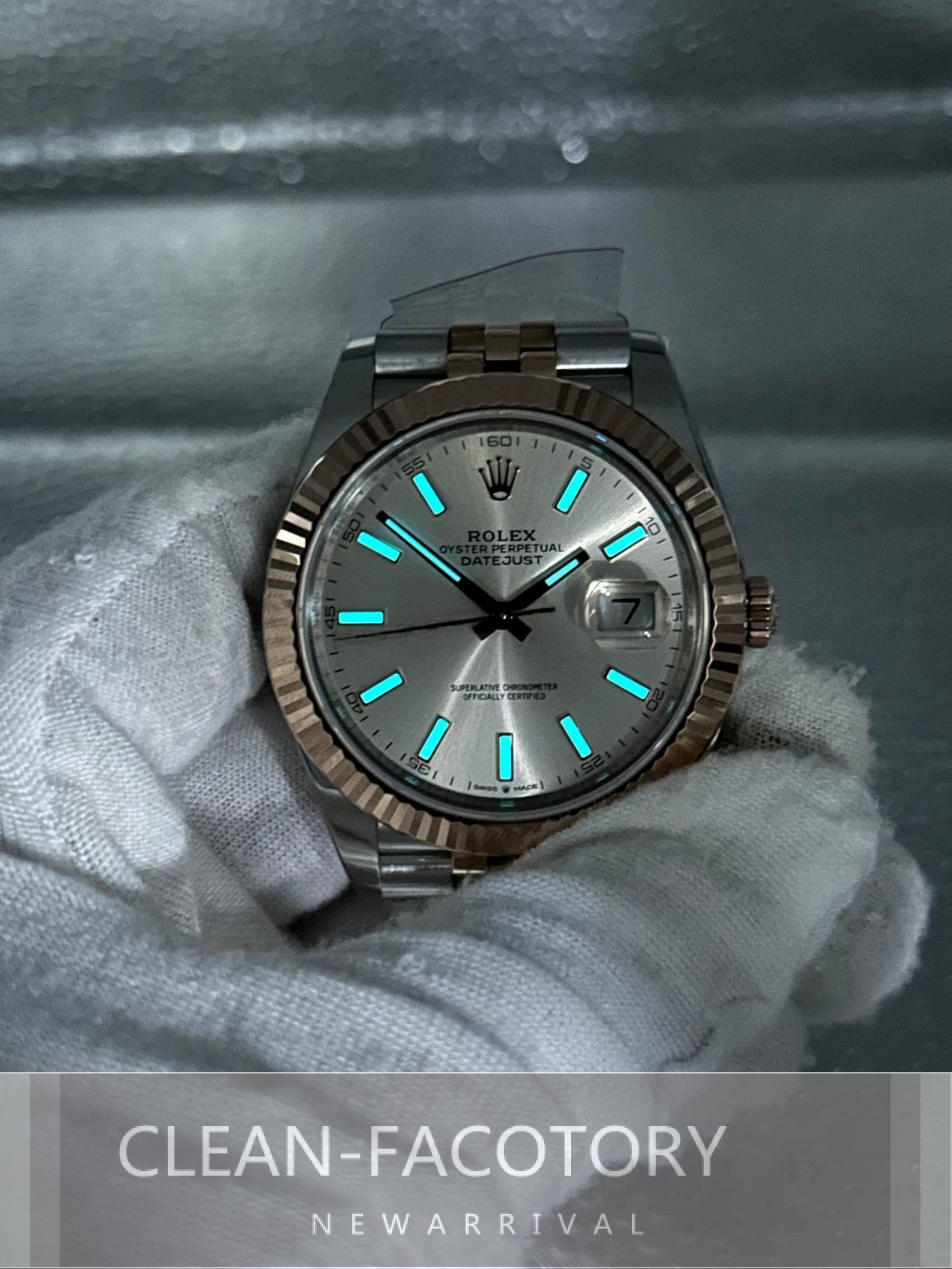 Το Rolex Datejust 41mm Ref. 126331 από την Clean Factory συνδυάζει την κομψότητα του Everose Rose Gold με την τεχνική αρτιότητα της 904L κάσας. Το Grey Fluted Dial προσφέρει μια εκλεπτυσμένη και μοντέρνα εμφάνιση, ενώ το Jubilee μπρασελέ σε δύο τόνους υπογραμμίζει τη διαχρονική πολυτέλεια του μοντέλου.